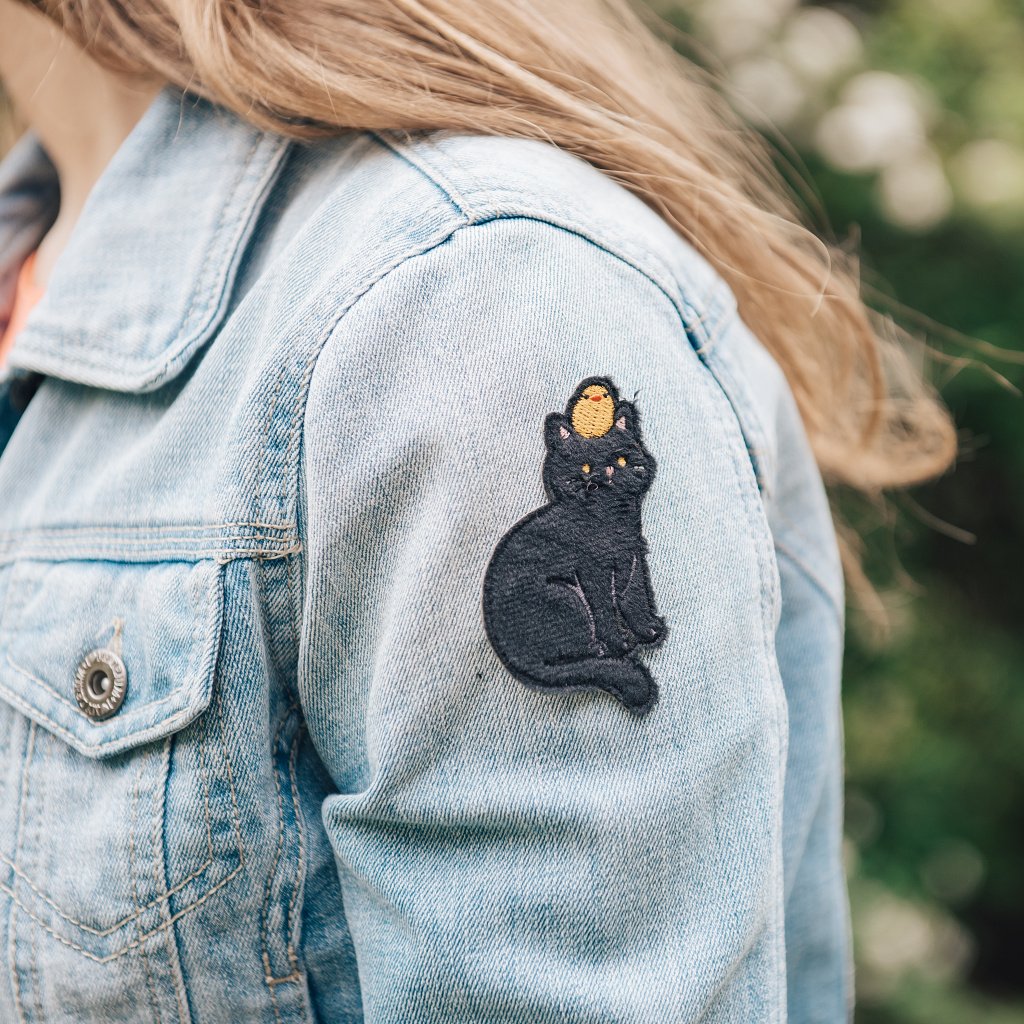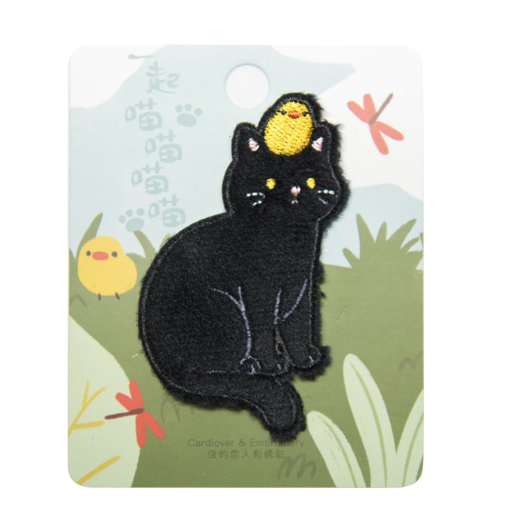 Nažehlovací nášivka Černá kočka s kuřetem na hlavě, 4,5 x 7,8 cm